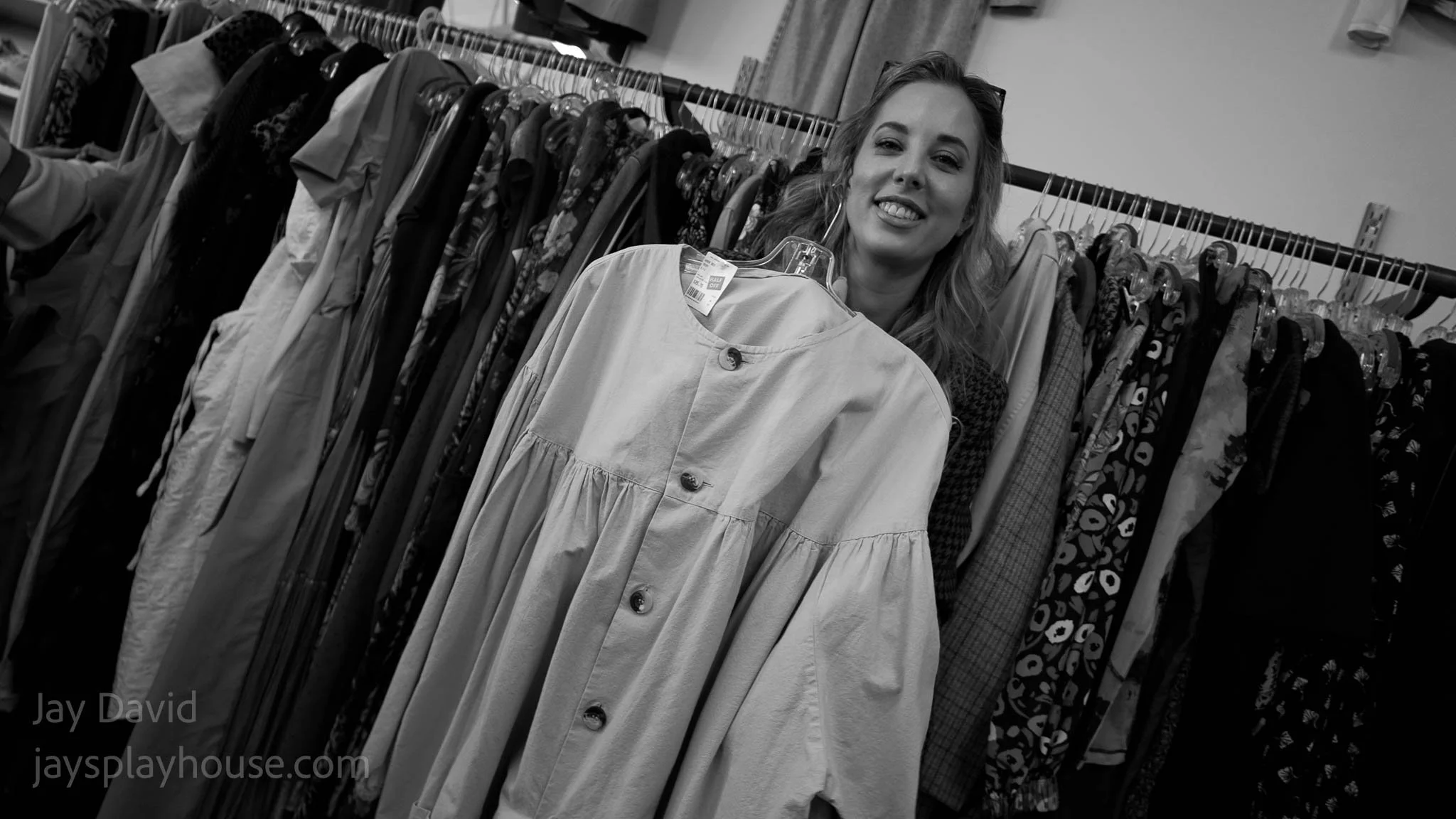 Throughout the day, the real charm comes from the in-between moments. Whether she’s debating yet another tiny white shirt addiction, testing out dresses that may or may not make sense at first glance, or talking through the reality of sizing struggles, everything feels unfiltered and real. There’s a constant push and pull between “this is a vibe” and “this might be a mistake,” and that’s what makes thrifting with Millie so entertaining. Even the unexpected moments—like running into someone she knows or navigating an asthma flare-up from all the fabric-heavy racks—add to the authenticity of the experience.